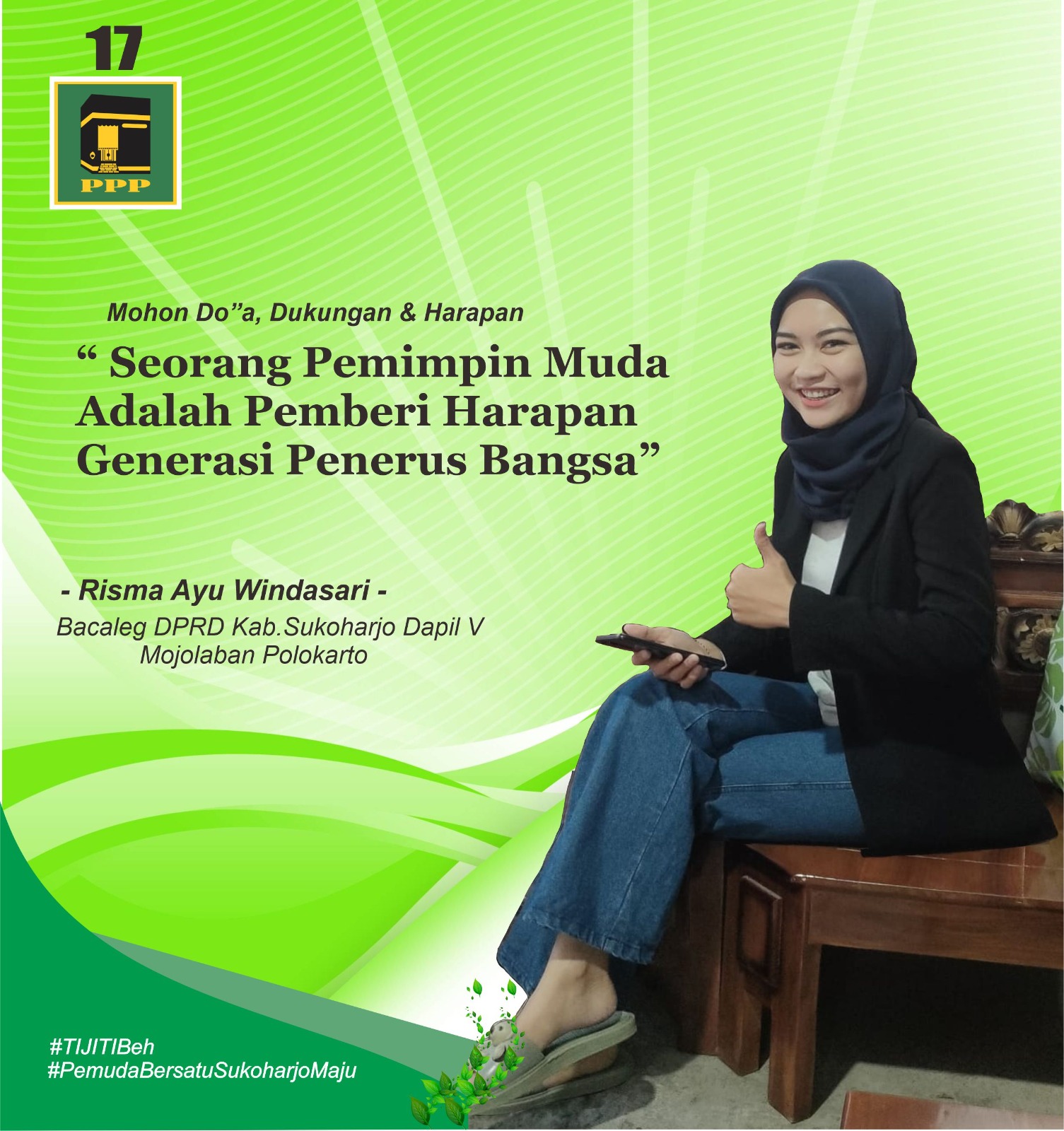 Berbeda dengan Caleg Milenial Dapil 5 Kabupaten Sukoharjo, yang meliputi Kecamatan Polokarto dan Kecamatan Mojolaban Risma Ayu Windasari, 25 tahun Warga Dk.Ngleses RT.04/RW.02, Ds.Pandeyan, Kec.Grogol, Kab.Sukoharjo ini, sudah sejak lama bak “sekali mendayung dua tiga pulau terlampaui” yakni sibuk kuliah dan merajut pencalegannya. Visinya,”Bergerak Bersama Rakyat” Caleg belia anak pertama dari 3 saudara ini mendapat pendampingan dari konsultan politik dan praktisi hukum Didik Rudiyanto,SH,MH,menjadi Caleg nomor urut 1 Dapil 5 Partai Persatuan Pembangunan (PPP). Sedangkan Caleg DPC.PPP Kab.Sukoharjo DCT nya sebanyak 14 Caleg, masing-masing Caleg Pria sebanyak 7 orang dan Caleg Perempuan sebanyak 7 orang.